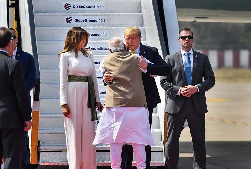 भारत के दो दिवसीय दौरे पर सोमवार को गुजरात के अहमदाबाद पहुंचे अमेरिका के राष्ट्रपति डोनाल्ड ट्रंप और उनकी पत्नी मेलानिया ट्रंप का स्वागत रेड कारपेट पर किया गया। उनके साथ उनकी बेटी इवांका ट्रंप और 12 सदस्यीय प्रतिनिधिमंडल भी है। प्रधानमंत्री नरेंद्र मोदी ने ट्रंप को गले लगाकर उनका स्वागत किया और मेलानिया से हाथ मिलाया।