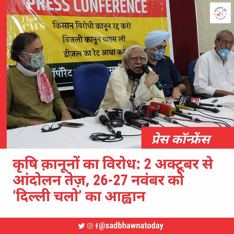 नए कृषि क़ानूनों के ख़िलाफ़  ने को प्रेसवार्ता के माध्यम से बताया कि किसान 2 अक्टूबर से शुरू करके देशभर में किसानों के बड़े विरोध करेंगे, जो 26-27 नवम्बर को ‘दिल्ली चलो’ कार्यक्रम के रूप में सम्पन्न होंगे।
