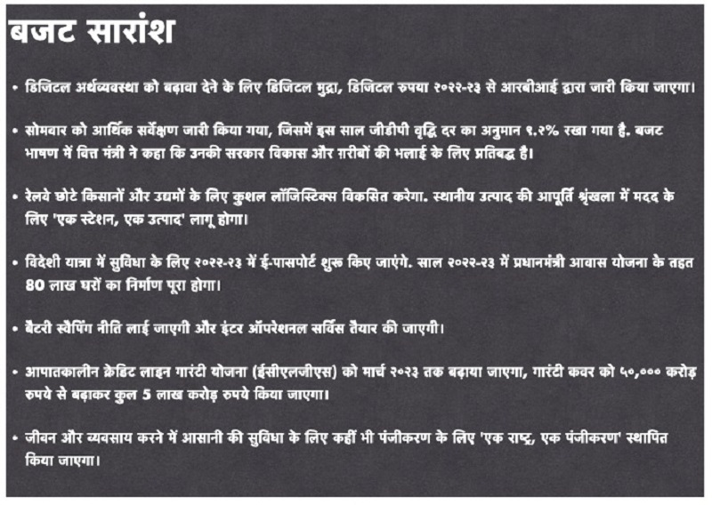 फिर भी पांच राज्यों के विधानसभा चुनाव से पहले आए इस बजट में वित्तमंत्री ने इसे “अमृत काल के अगले २५ सालों का ब्लू प्रिंट” बता डाला। उन्होंने कहा, “इस बजट से ६० लाख नई नौकरियों का सृजन होगा। अगले तीन साल में ४०० नई जेनरेशन की वंदे भारत ट्रेनें लाई जाएंगी और अगले तीन सालों में १०० पीएम गति शक्ति कार्गो टर्मिनल विकसित होंगे। साथ ही ई-चिप लगे पासपोर्ट इसी साल आएंगे। पोस्ट ऑफिसों यानी डाकघरों को कोरबैंकिंग सिस्टम से लैस किया जाएगा। 5जी सेवा इसी साल आएगी और गांवों को ब्रॉडबैंड से जोड़ा जाएगा।”