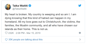 ‘‘थॉर राग्नारोक’’ और ‘‘हंट फॉर द वाइल्डरपीपुल’’ जैसी फिल्मों के निर्देशन से मशहूर हुए वाइटीटी ने टि्वटर पर शोक संतप्त समुदाय के प्रति समर्थन जताया। उन्होंने लिखा, ‘‘मेरा दिल टूट गया है। मेरा देश रो रहा है और मैं भी। यह जानकर मेरा दिल बैठा जा रहा है कि मेरे देश में इस तरह की नफरत हो सकती है।