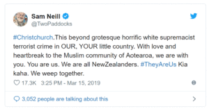 स्टीवन स्पिलबर्ग की ‘‘जुरासिक पार्क’’ जैसी फिल्मों में काम करने वाले नील ने टि्वटर पर कहा, ‘‘यह हमारे, आपके छोटे से देश में भयानक श्वेत वर्चस्ववादी आतंकी अपराध से परे है। हम आपके साथ हैं। आप हमारे हैं। हम सभी न्यूजीलैंडवासी हैं।’’