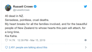 क्राइस्टचर्च, पीड़ितों, परिवारों, मुस्लिम समुदाय और इस देश में रहने वाले लोगों के लिए मैं प्यार जताता हूं।’’ रिडले स्कॉट की ‘‘ग्लैडिएटर’’ के लिए सर्वश्रेष्ठ अभिनेता के ऑस्कर पुरस्कार से सम्मानित क्रो ने इस घटना को ‘‘मूर्खतापूर्ण और बेहूदा’’ बताया।