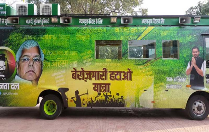 बस गहरे हरे रंग की है, जिस पर बड़े शब्दों में ‘बेरोजगारी हटाओ यात्रा’ लिखा गया है। बस के सामने के शीशे में ‘नया बिहार’ लिखा हुआ है।