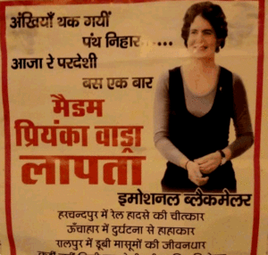 सेवा के लिए दिहने रहै वोट, लेकिन प्रियंका सोनिया किहिन दिल पर चोट। फिरोज की नातिन रेहान की माई, चुनाव मा मंदिर-मंदिर परी दिखाई।’ हालांकि यह पोस्टर किसने लगवाए हैं, उसका नाम नहीं है।